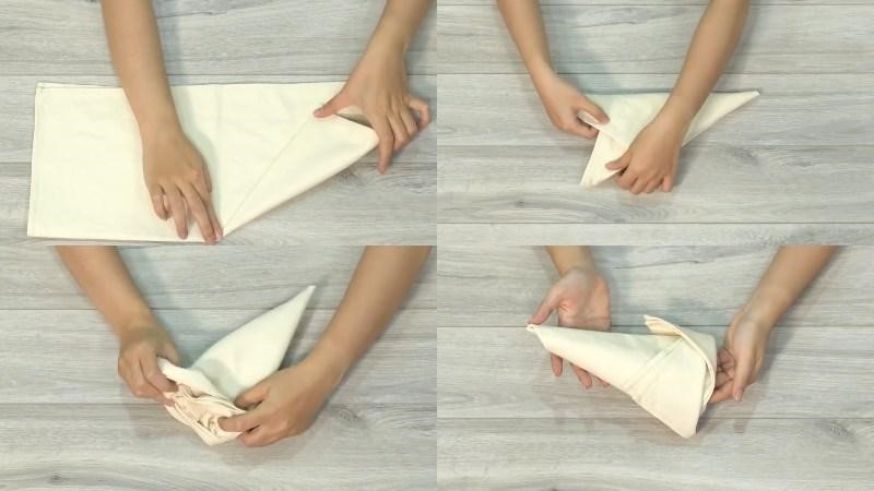 Khăn đa năng có nhiều màu sắc và kích thước nhỏ gọn. Nên khăn sẽ dễ dàng gấp thành nhiều hình dạng khác nhau để tạo thành những trang trí trong bàn tiệc. Bạn có thể tận dụng chiếc khăn để gấp một số hình đơn giản để tạo điểm nhấn cho chiếc bàn ăn của mình. Dưới đây là một số cách để bạn gập khăn