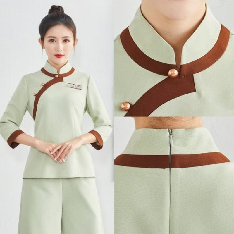 Đồng phục có thể kết hợp linh hoạt với quần ống suông hoặc chân váy, phù hợp cho nhiều loại hình spa từ chăm sóc sắc đẹp, massage đến trị liệu cao cấp. Bên cạnh đó, màu sắc cũng là yếu tố quan trọng trong thiết kế đồng phục spa phong cách Trung Hoa.