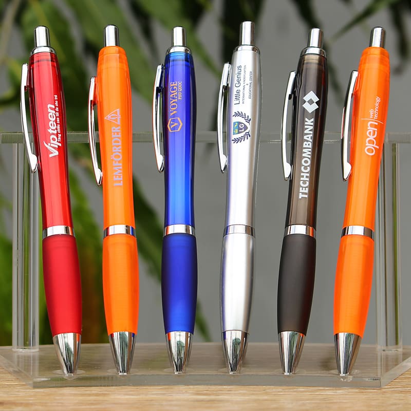 Đây là lựa chọn sáng tạo và khá mới mẻ mà bạn có thể tham khảo. Cách in này giúp tạo sự khác biệt và dễ nhận diện khi khách hàng cầm bút |
