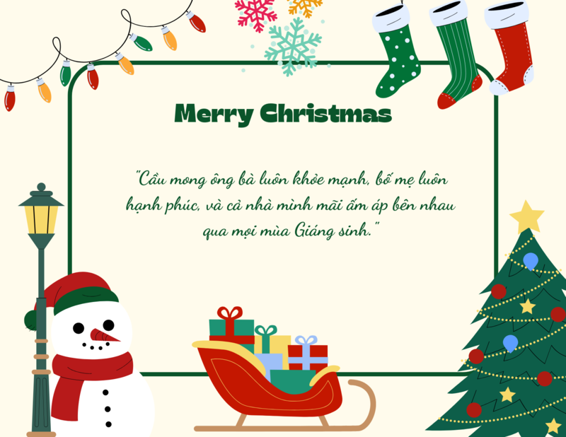 - Giáng sinh này, con/cháu chỉ mong Ba Mẹ/Ông Bà luôn thật khỏe mạnh, an lành và bình yên. Cảm ơn Ba Mẹ/Ông Bà đã luôn là ngọn lửa ấm áp nhất trong cuộc đời con/cháu. Yêu gia đình nhiều lắm!