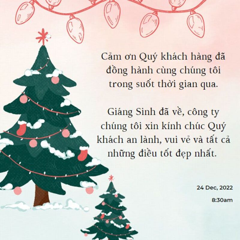 - Giáng Sinh là thời khắc của sẻ chia và tri ân. Xin chân thành cảm ơn Quý khách hàng đã luôn tin tưởng và đồng hành trong suốt thời gian qua. Kính chúc Quý vị một mùa Noel thật ấm áp, hạnh phúc bên gia đình và người thân, đồng thời đón chào năm mới với nhiều cơ hội, thành công và thịnh vượng.