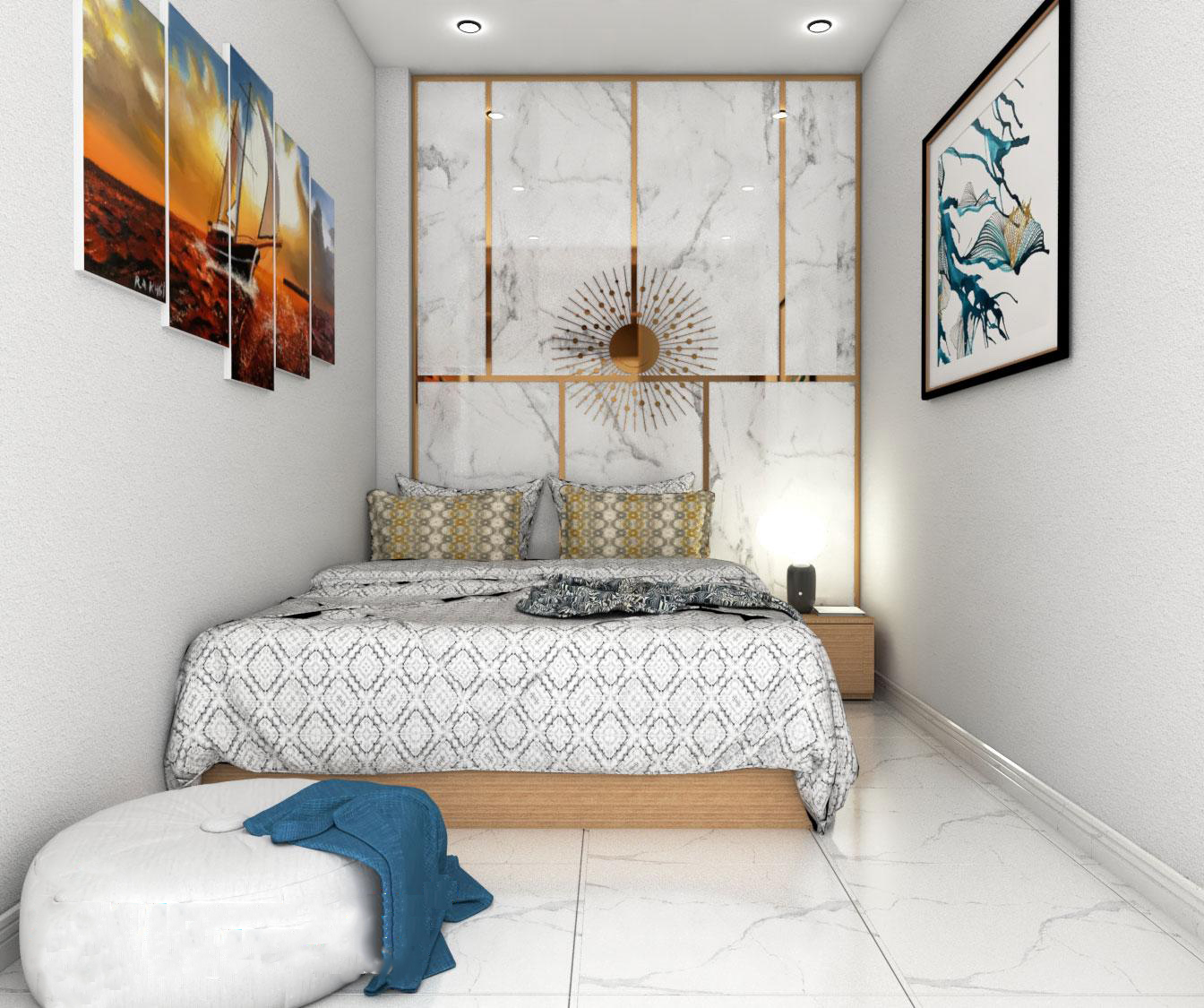 Nếu như bạn không muốn căn phòng ngủ của mình quá nhàm chán, thì hãy thử trang trí thử bằng những bức tranh treo tường độc đáo và bắt mắt. Thay vì những bức tranh nhiều màu sắc và phức tạp, hãy chọn những bức tranh treo tường theo phong cách vector hoặc đen trắng đơn giản.