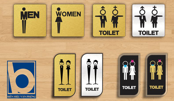 Biển hiệu nhà vệ sinh. Hệ thống biển bảng nhà vệ sinh có thể được thiết kế theo nhiều hình thức khác nhau vầ được đặt ở nhiều khu vực và vị trí vệ sinh khác nhau như biển treo trần, biển dán tường...Nội dung trên biển có thể thiết kế theo nhiều hình thức khác nhau có thể là kí hiệu, chữ viết, tên tiếng việt, tiếng anh...điều đó tùy thuộc vào phong cách của từng khách sạn.