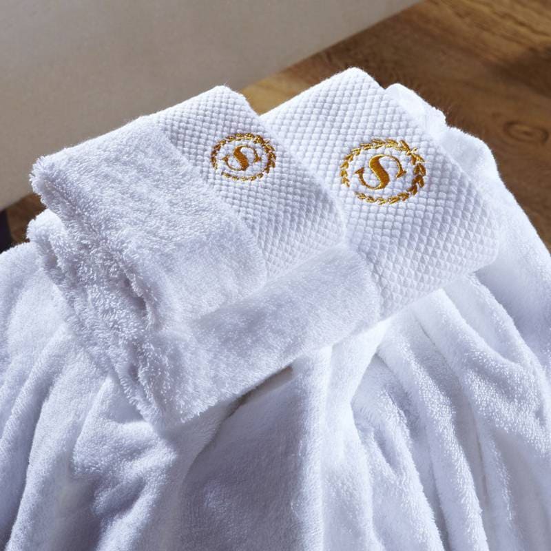 Bộ khăn khách sạn bao gồm: khăn tắm, khăn mặt, khăn gội, khăn lau tay được thêu logo tinh tế. Cũng giống như spa thì bộ sản phẩm này được sử dụng làm quà lưu niệm cho khách hàng VIP hoặc khách hàng thân thiết.