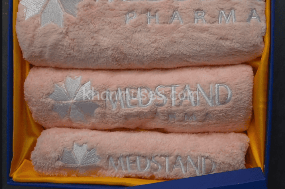Ảnh thực tế khăn siêu mềm thêu logo Dược phẩm Medstand (Medstand Pharma)