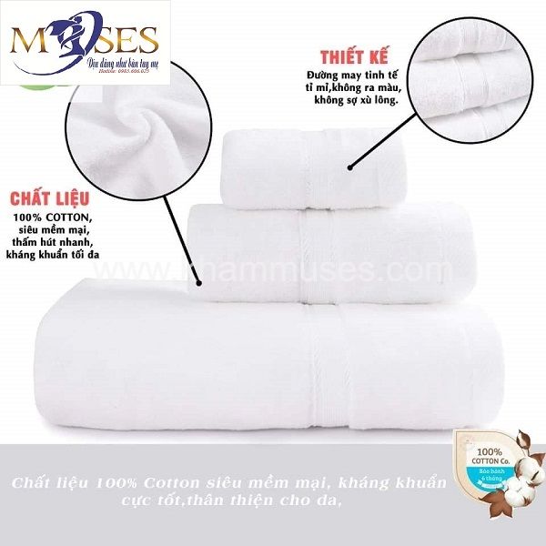 Khăn Bông Nữ Thần Muses chuyên cung cấp khăn tắm khách sạn, khăn spa cao cấp với thành phần 100% cotton bông nở tự nhiên. Khăn siêu mềm mịn phù hợp với mọi làn da, kể cả làn da nhạy cảm nhất. Với chất cotton cao cấp sợi lông nhẹ và dày dặn có tác dụng giữ nhiệt tốt, thông thoáng khí, hút nước cực tốt. Đặc biệt khăn không bị xù lông, không sổ chỉ. Với tác dụng chính lau khô làn da, đầu tóc và toàn bộ cơ thể khi tắm gội.