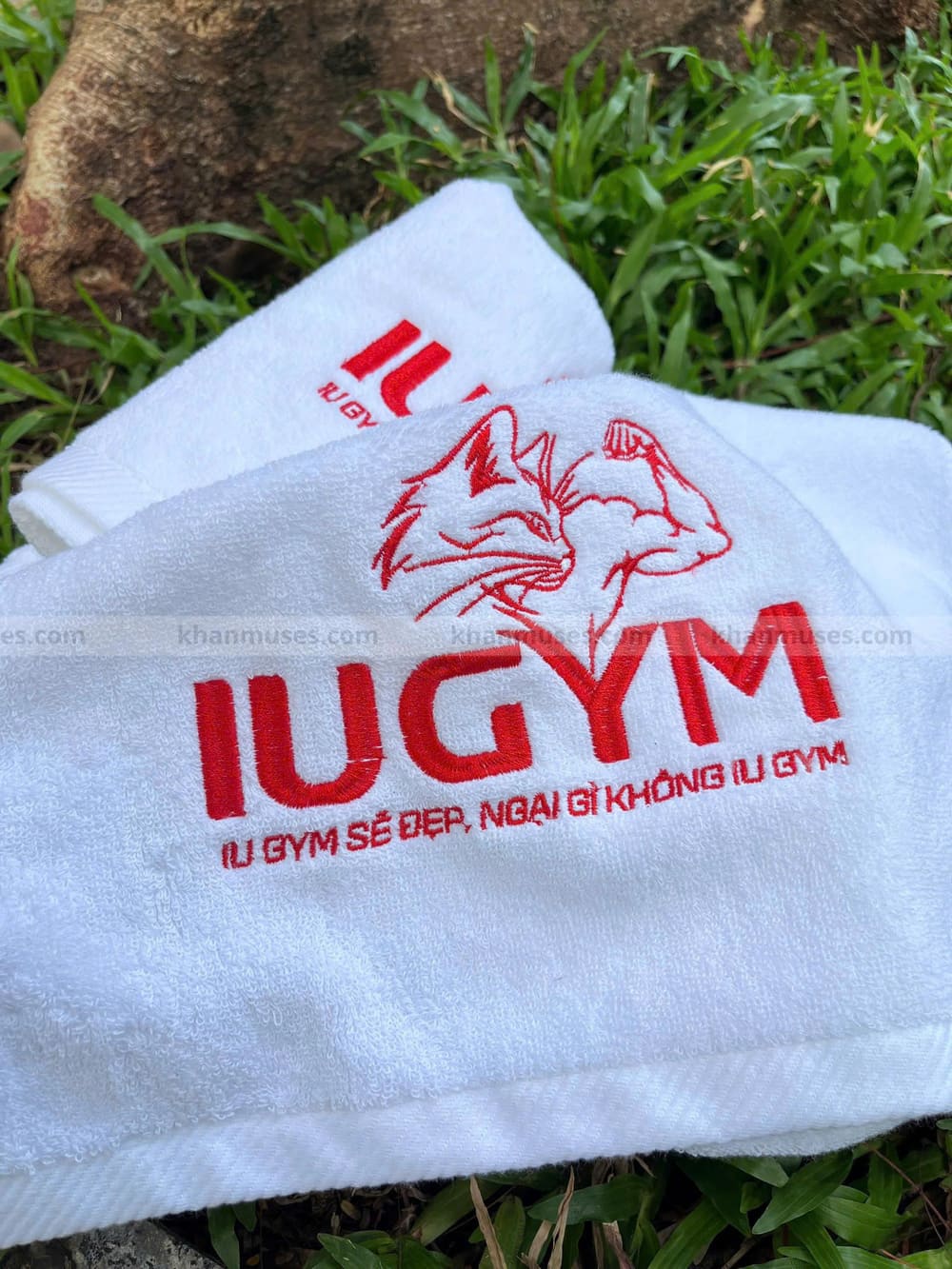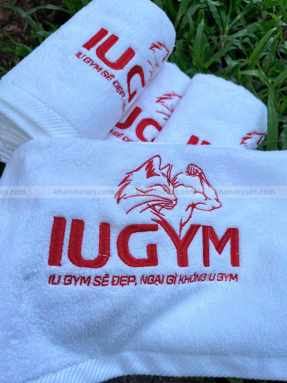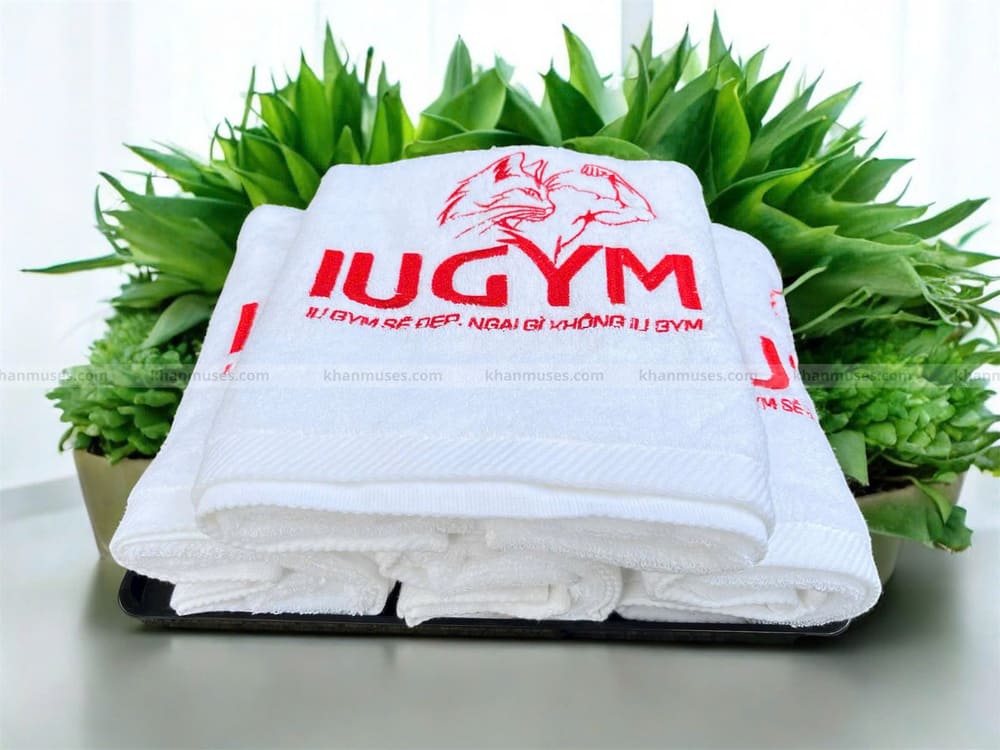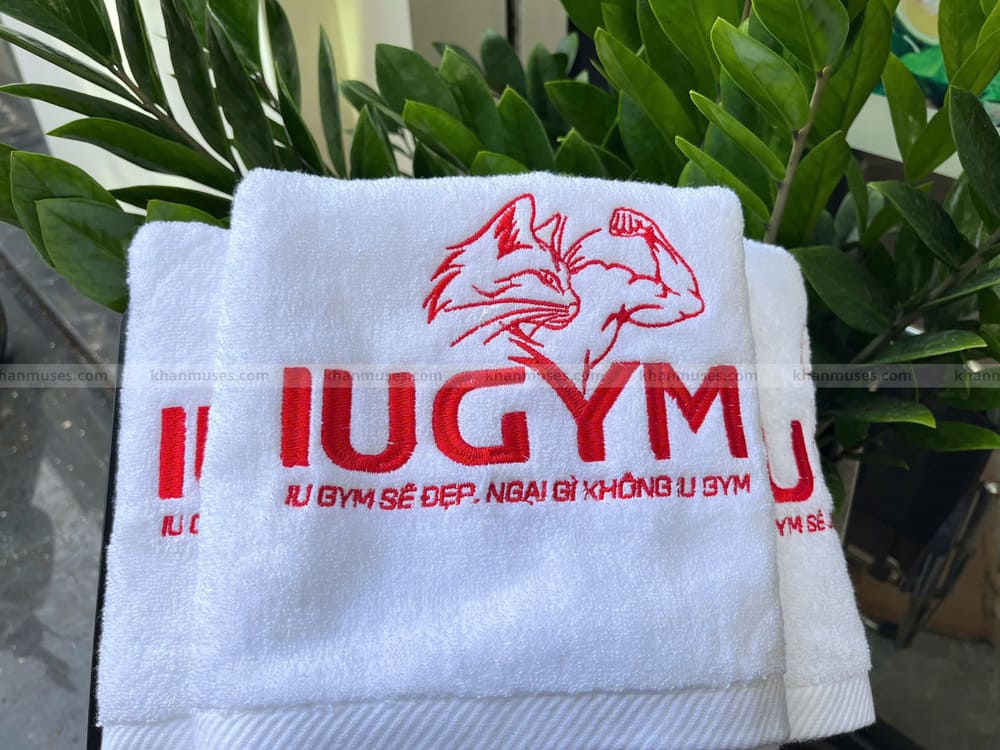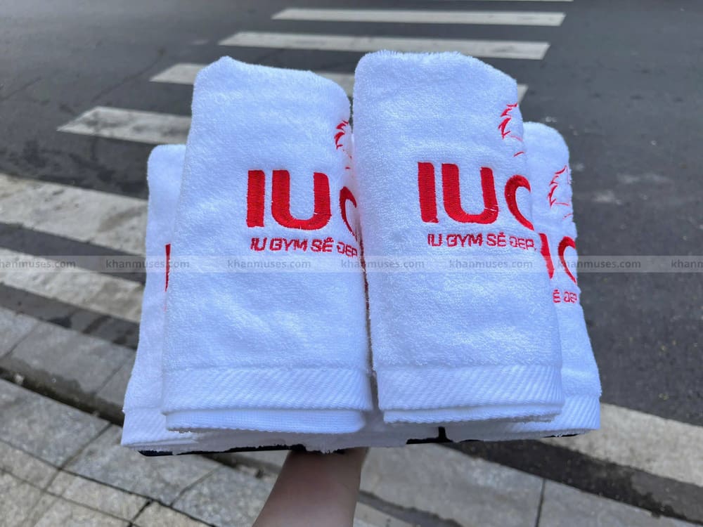 Dưới đây là hình ảnh thực tế sản phẩm khăn 100% cotton thêu logo Trung tâm IU GYM BÌNH DƯƠNG: