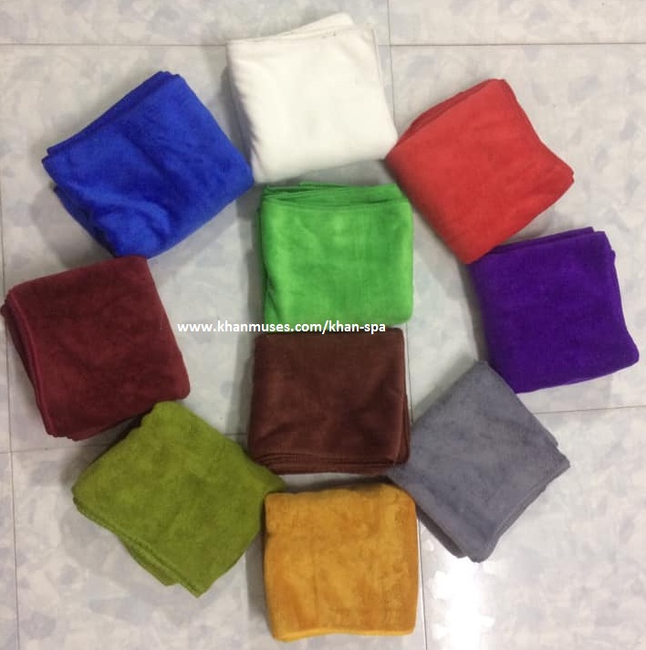 Khăn spa với nhiều màu sắc đa dạng cho khách lựa màu : Khăn màu Rêu, Tím, Xanh Blu, Xanh lá cây, vàng bò, Nâu , Đỏ đô, Xám , trắng, Đỏ tươi ...